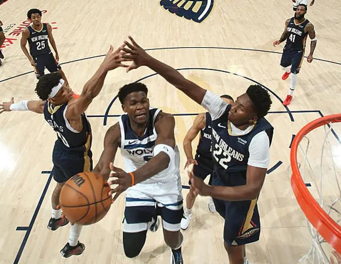 森林狼队一度建立起18分的巨大领先优势,靠的是高度优势,在篮板球之争上占据上风,篮板球47-39赢了对手8个,前场篮板球20-6赢了对手14个。森林狼队未能将优势转化为胜势,关键在于他们未能在三分线外稳定高效匹配鹈鹕队的火力。全场比赛下来,森林狼队三分线外40投仅13中,三分球命中率仅有32.5%,反观鹈鹕队,三分线外34投15中,三分球命中率高达44.1%。