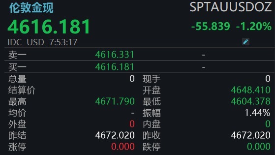 金银价格下跌,截至发稿,伦敦金现盘中失守4610美元/盎司,日内跌幅1.38%,伦敦银现日内跌超2%,盘中最低报71.16美元/盎司。