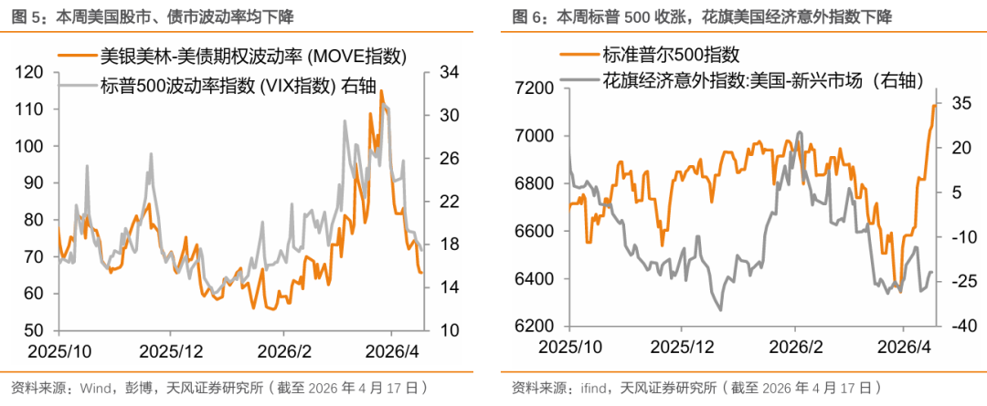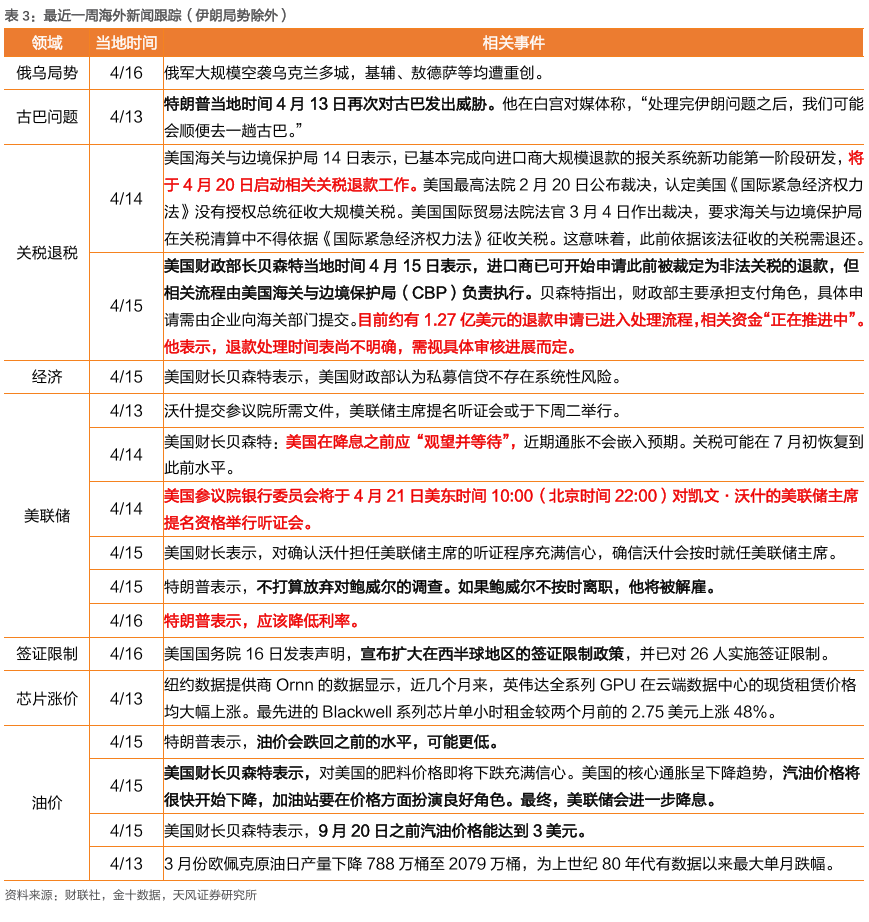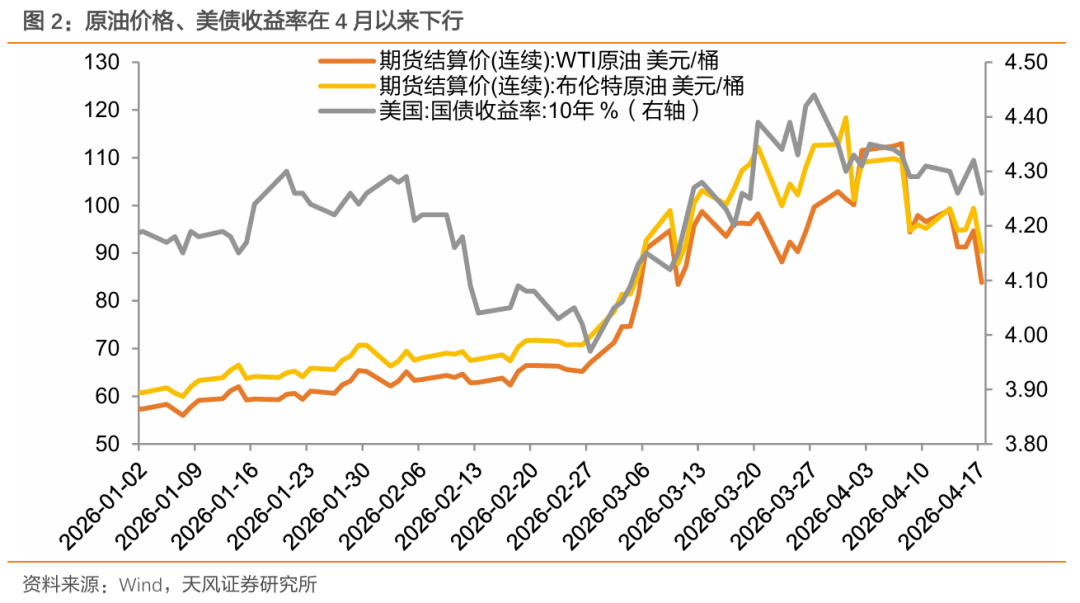 4月16日,以色列与黎巴嫩同意进行为期10天的停火;4月17日周五,伊朗和美国宣布霍尔木兹海峡对商船“完全开放”,国际原油重挫;当日标普、纳指创历史新高,纳指实现连续13个交易日收涨,美债收益率显著下行。