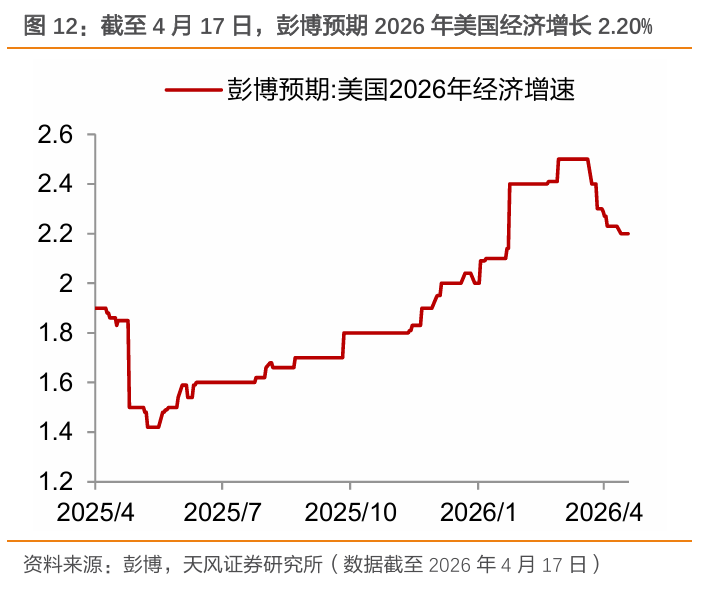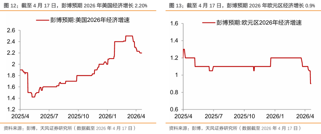 最近一周,26年欧美经济增速的市场预期下调。截至4月17日,彭博一致预期2026年美国经济增速为2.20%,一周之前的预期为2.23%;预期2026年欧元区经济增长0.9%;一周之前的预期为1.05%。