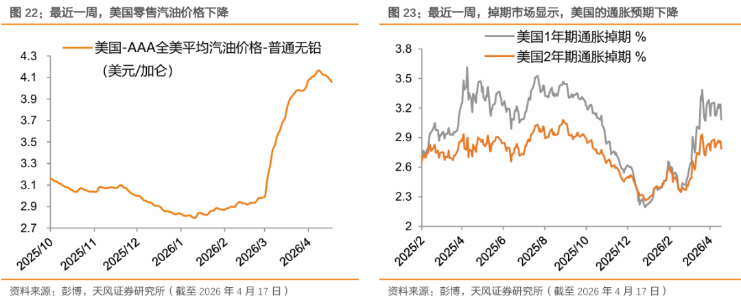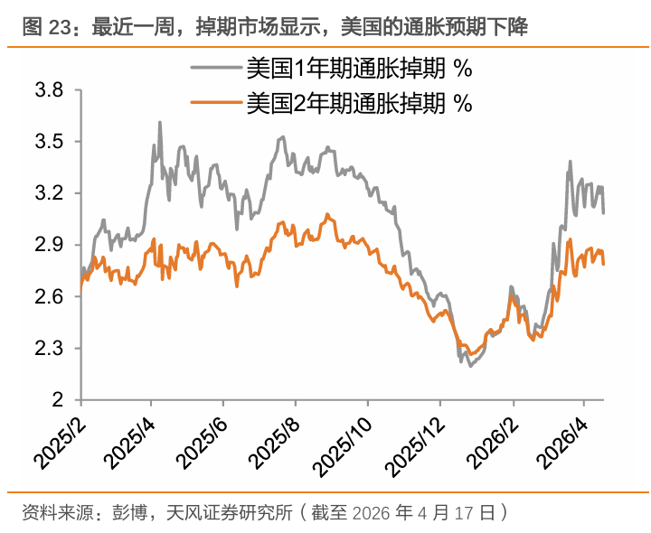 掉期市场显示,美国的通胀预期下降。截至4月17日,美国1年期通胀掉期3.085%,2年期通胀掉期2.788%,分别较一周之前下行6bp、5bp。