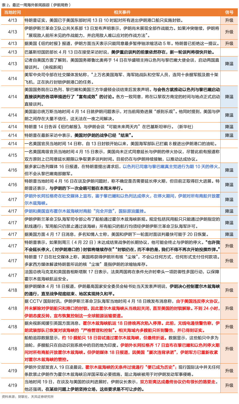 本周美伊局势有所缓和,推动美股创历史新高。但局势在周末反转升级。4月17日周五,伊朗和美国宣布霍尔木兹海峡对商船“完全开放”,国际原油重挫,标普和纳指创历史新高。但4月18日晚,伊朗称由于美国违反停火协议,因此霍尔木兹海峡从18日当晚起重新关闭。