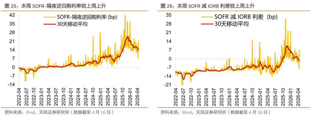 本周美国信用利差下降。CCC企业债信用利差本周下行25bp至9.21%。流动性方面,SOFR和隔夜逆回购协议的利差在本周的均值为17.00bp,高于前一周的均值10.80bp。