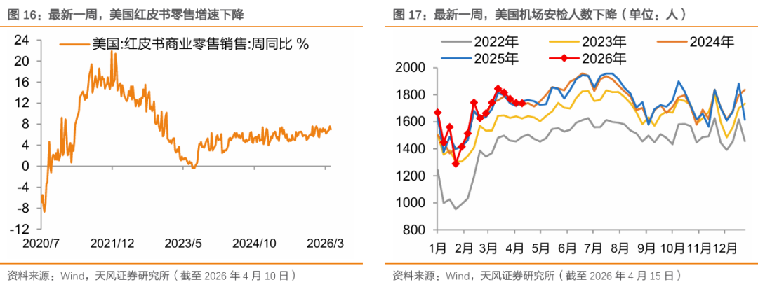 美国零售增速略降低,运输增速回落。美国截至4月10日当周的红皮书商业零售销售年率7.0%,前值7.6%。截至4月11日当周,美国铁路总运输50.0万辆,前值为50.1万辆,同比增速为-2.63%,前值1.03%。