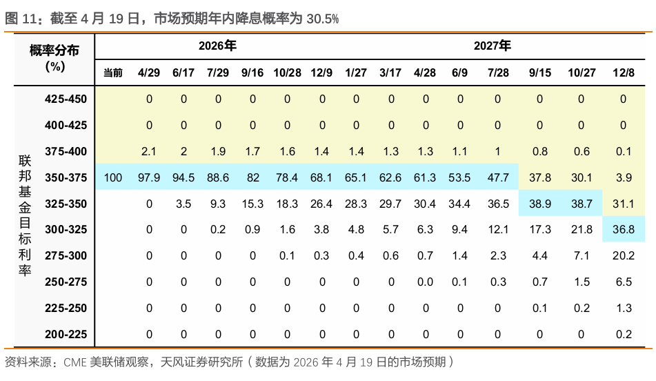 本周,市场对今年降息的预期升至30%以上。截至4月19日CME显示市场,市场预期今年降息的概率升至30.5%(一周之前为27.3%),预计年内加息的概率仅为1.4%(一周之前为1.5%),预期全年维持利率不变的概率为68.1%(一周之前为71.1%)。