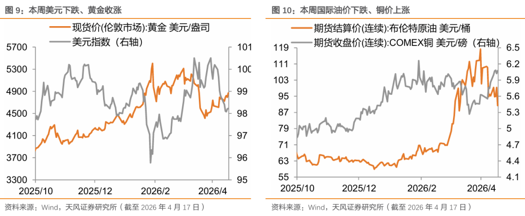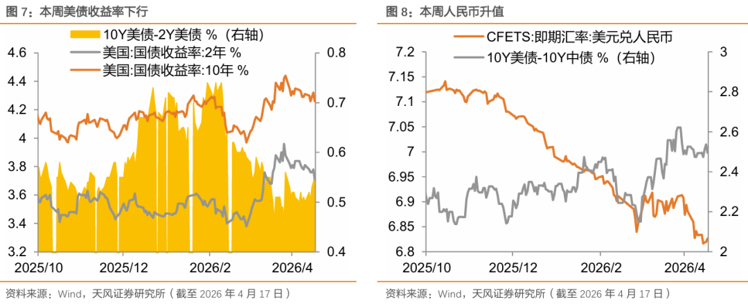 截至4月17日当周,美元指数下跌0.48%,欧元、人民币、日元兑美元分别上涨0.34%、0.43%和0.10%,截至4月17日当周,2Y和10Y美债分别下行10bp和5bp,10Y德债基本持平,10Y日债下行1.4bp。