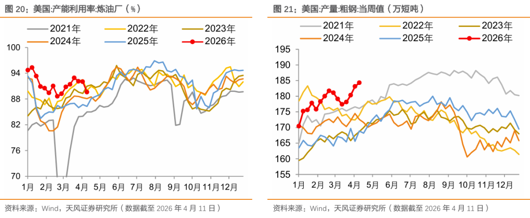 美国粗钢生产持续强劲,炼油厂产能利用率下滑。截至4月11日当周,粗钢当周产量184.3万短吨,高于去年同期的168.9万短吨;炼油厂产能利用率89.6%,高于去年同期的86.3%,但较前一周的92%明显下滑。