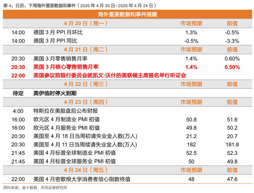 下周(4月20日~4日24日)海外重点关注:美国参议院银行委员会就凯文·沃什的美联储主席提名举行听证会;美伊临时停火到期;美国3月零售增速;欧美标普PMI。