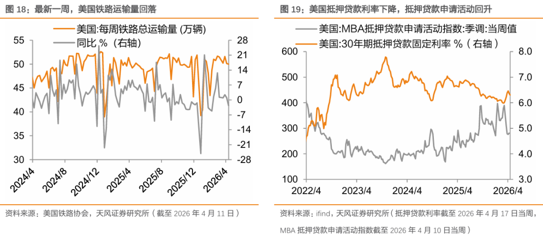 需求:美国零售增速下降,运输增速回落;抵押贷款利率下降,房地产市场活动略升。