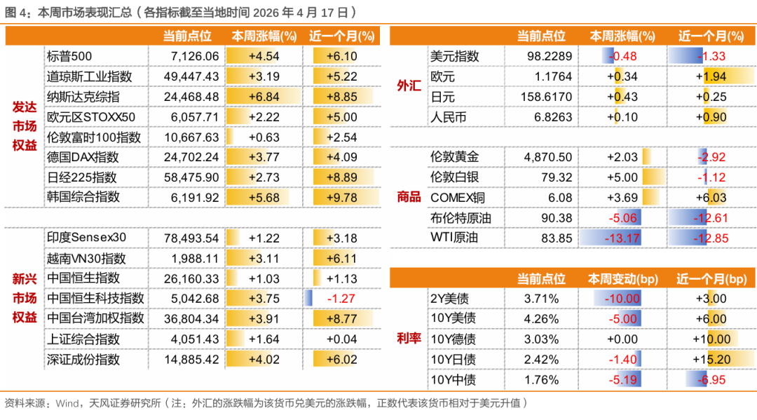 截至4月17日当周,标普500、道指、纳指分别上涨4.54%、3.19%和6.84%。伦敦富时100指数上涨0.63%,德国DAX指数上涨3.77%;亚洲方面,韩国综指和日经225指数分别涨5.68%和2.73%。